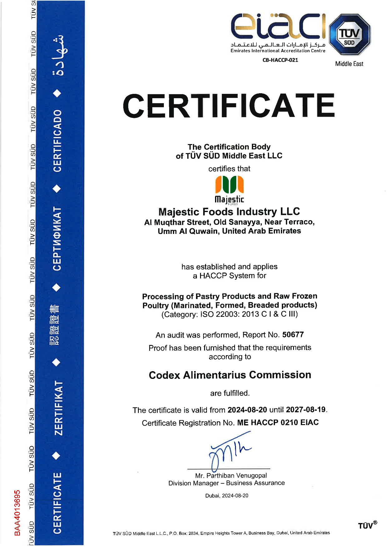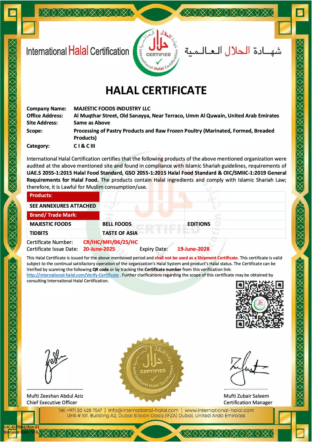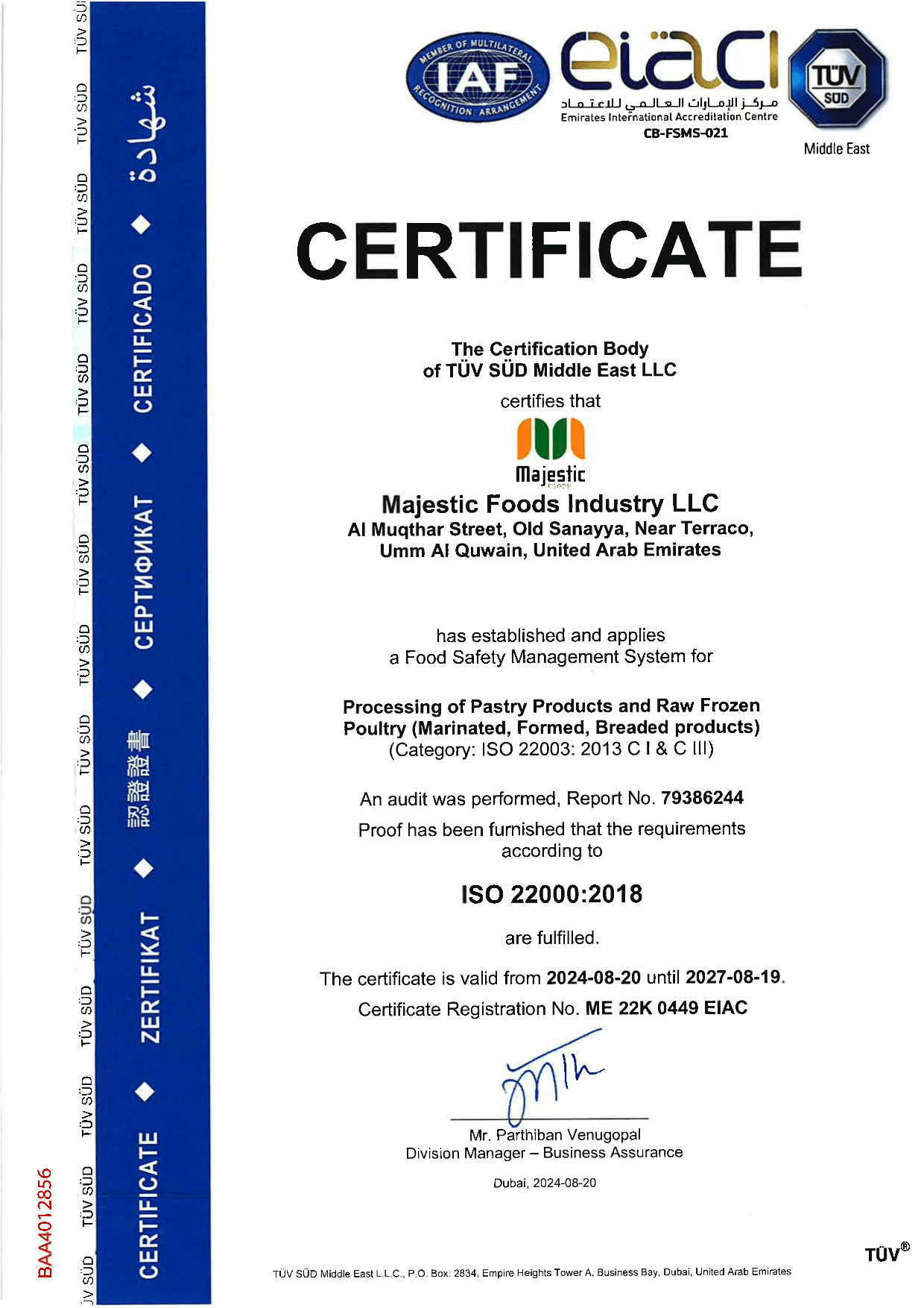 At Majestic Foods, we are proud to hold industry-recognized certifications in food safety, quality, and hygiene management. These certifications reflect our unwavering commitment to excellence, sustainability, and delivering safe, nutritious products to our customers worldwide.